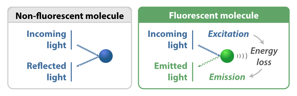 Light is made up of massless particles called photons, the tiniest possible packets of electromagnetic radiation. When photons hit special molecules responsible for fluorescence — called fluorophores — they excite electrons that had been buzzing around at their most stable “ground state.” The excited, higher energy state does not last long. During relaxation, the fluorophores re-emit the light they had absorbed. This time, the light has a longer wavelength and thus a different color.
